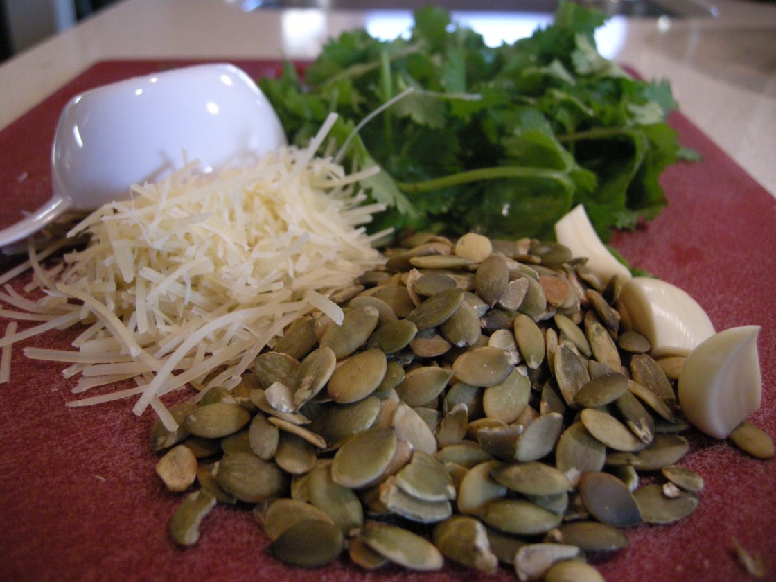 I tried a recipe from Stephen Pyles’ Southwestern Vegetarian and it was okay. The family devoured it, but it lacked a little punch. Pretty much everything in the recipe comes from my “pantry” stock, so it was really easy to make in a pinch. Next time around, I’ll probably up the portion of pumpkin seeds, add more lemon juice and maybe a dash of ancho puree into it.