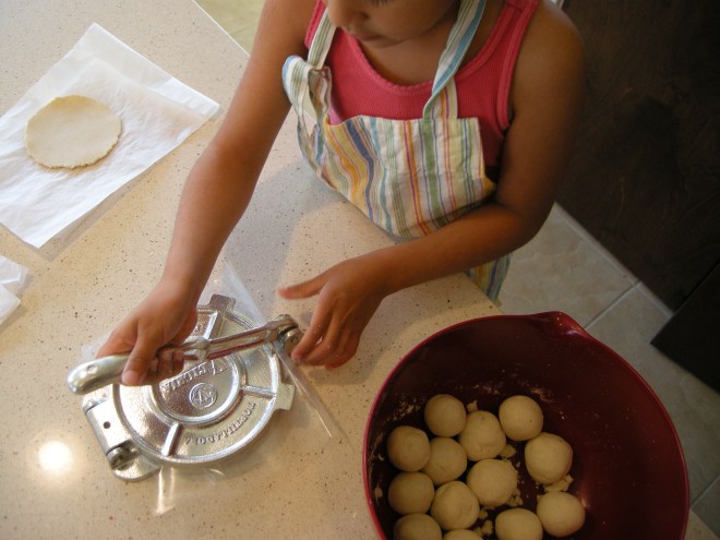 I’m not sure why it hadn’t occurred to me to have her do this before. Tortillas, yo! It was super-easy, fun and gave her the independence she needed. She loved getting her hands all up in it and the process of pressing the tortillas was just easy and repetitive enough to make it seem manageable.