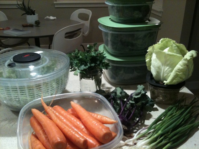 We’ll more than likely dive into the lettuce greens tomorrow with a salad and go at the rest over the next week or so. The carrots seem insurmountable at the moment, but I’ll peel and matchstick a good portion of them in the morning for dipping and snacking on. That and my daughter should put a serious dent in it.