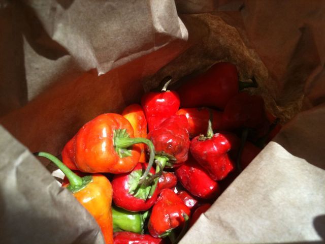 Bell peppers, onions, basil, cukes (two types), eggplants, zucchini, yellow squash, jalapeños, red chile peppers, poblanos, garlic, another green pepper, mint, tomatoes, okra and the hinkelhatz peppers pictures above.