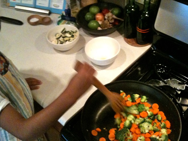 She made Vegetarian Stir-Fried Rice from Honest Pretzels* a couple of days ago and it was quite yummy. A simple little stir-fry, that pleased and filled our tummies. She wasn’t very happy with the results – the rice tasted too much like the carrots and broccoli. Go figure.