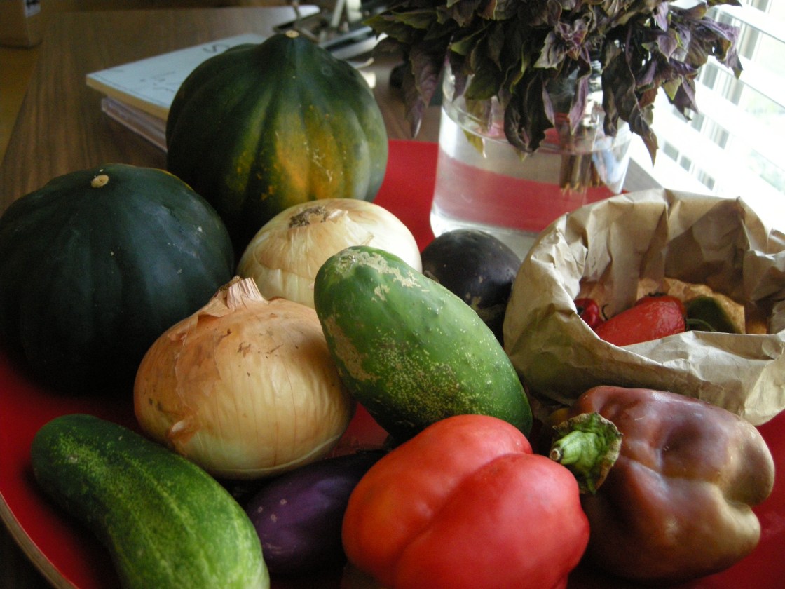 The summer heat has finally taken a toll on Texas gardens and crops and our CSA box is showing it – no more tomatoes (gasp!). What is pictured above is what we have left – acorn squashes, cukes, onions, bell peppers, eggplant, basil and hot peppers. We’ve eaten through the purslane, yellow summer squashes, okra (today!), lots of peppers (sweet and hot), some onions and some eggplant.