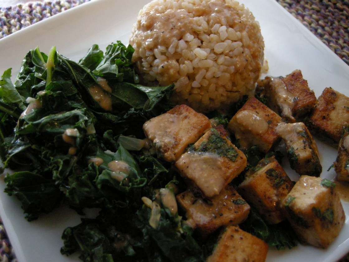 Pictured above is one my husband’s current favorites – short grain brown rice, kale, peppered tofu crisps and a delicious cashew tamari dressing. We make it in all sorts of variations – collard greens, vegetable medley, quinoa, beans. It’s kinda hard to go wrong with something as basic as grain/veg/protein combos.