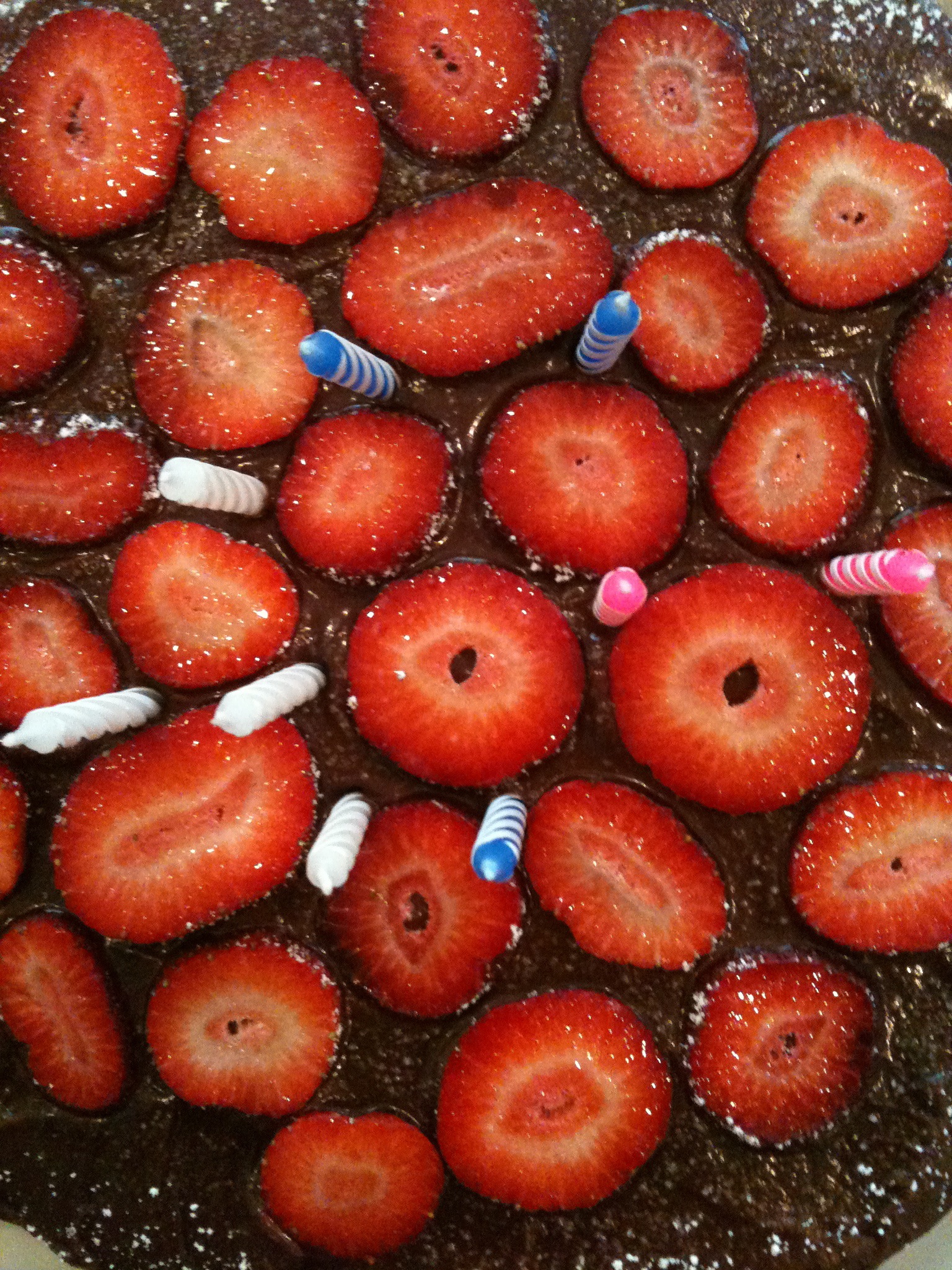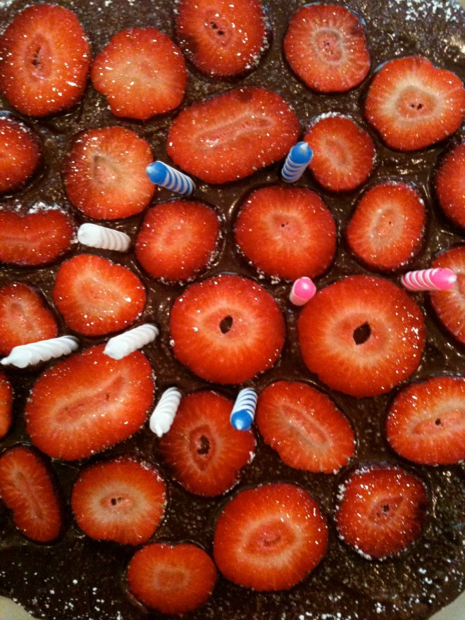 It wasn’t perfect. It was far from, but it was moist and gooey and chocolatey (without being too much so) and I made it so it was fantabulous! I used this recipe for the cake, a Martha Stewart one for the frosting and added some strawberries (my sister’s favorite) at the last-minute.