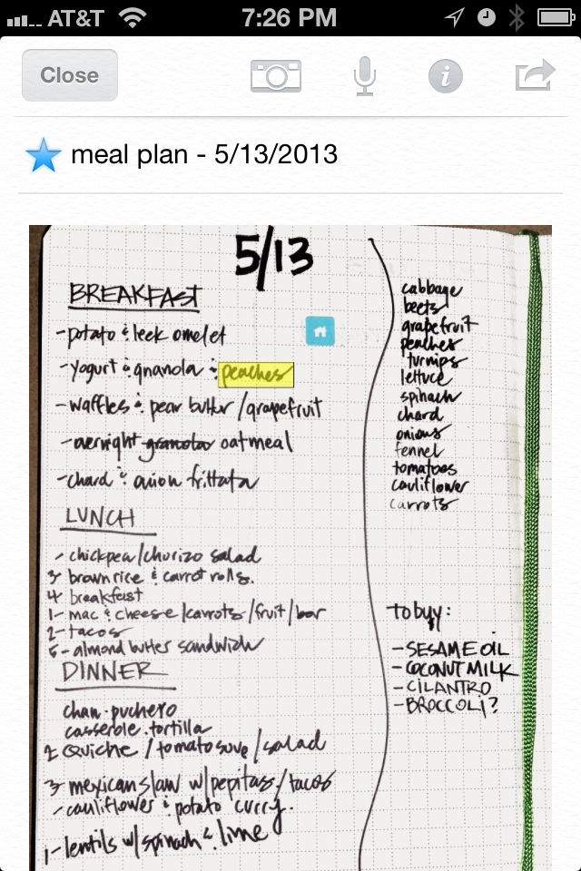 I had a pretty fantastic weekend. So great, that I even managed to set aside some time for meal planning. Trying out my mother’s day gift (an Evernote Moleskine) may have also been a motivating factor. 😉