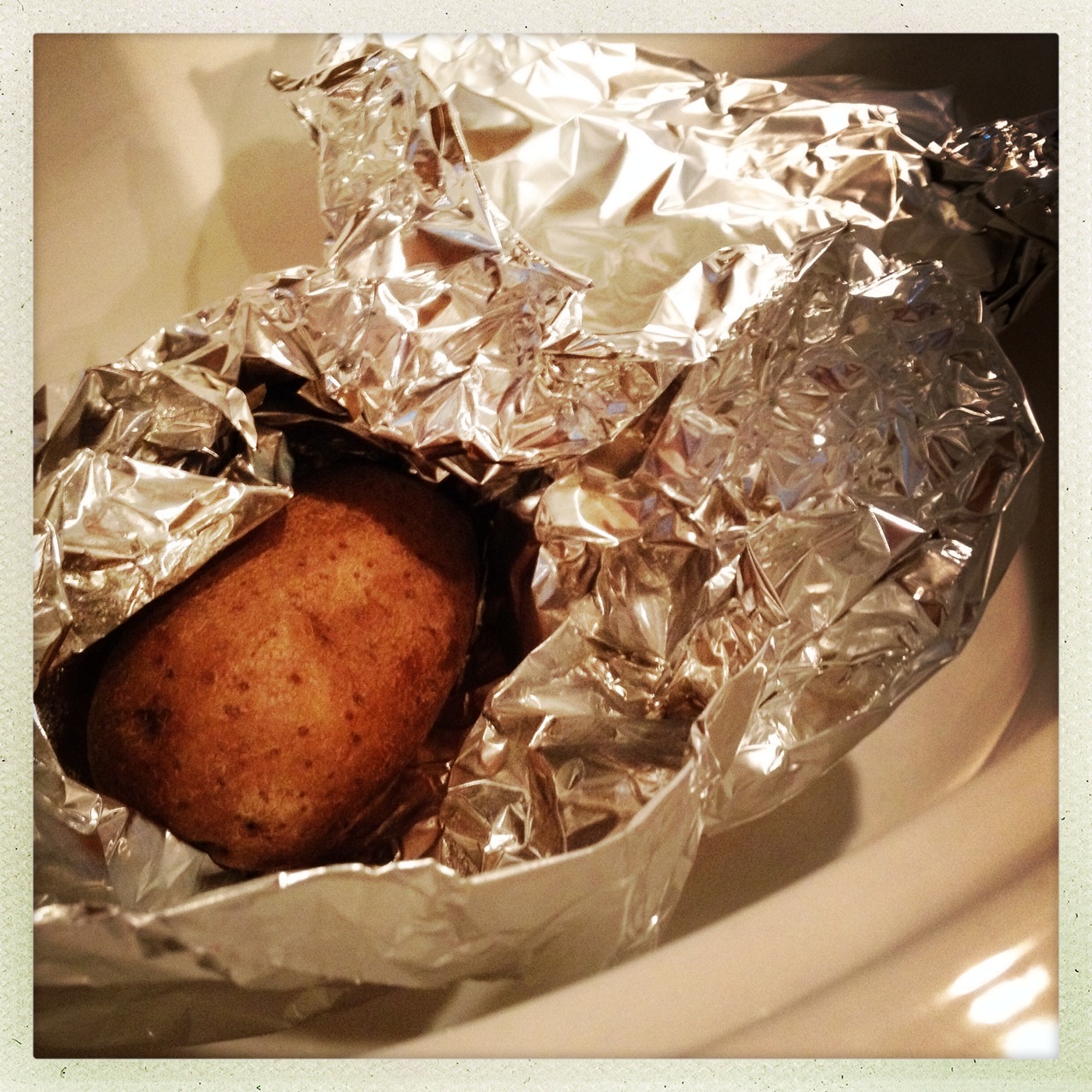 Wrap ’em in foil if you like the skins tender. Leave ’em bare if you like a crispy skin. Pop ’em in the crockpot and set to high 4 hours. You end up with tender fluffy potatoes come dinner time without fuss or a hot kitchen!
