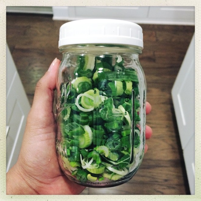P.S. Chop that bunch of scallions as soon as you get home with them and place them in a jar. Having them ready to go means they get used up! Throw in your salad or morning scrambles. 🙂