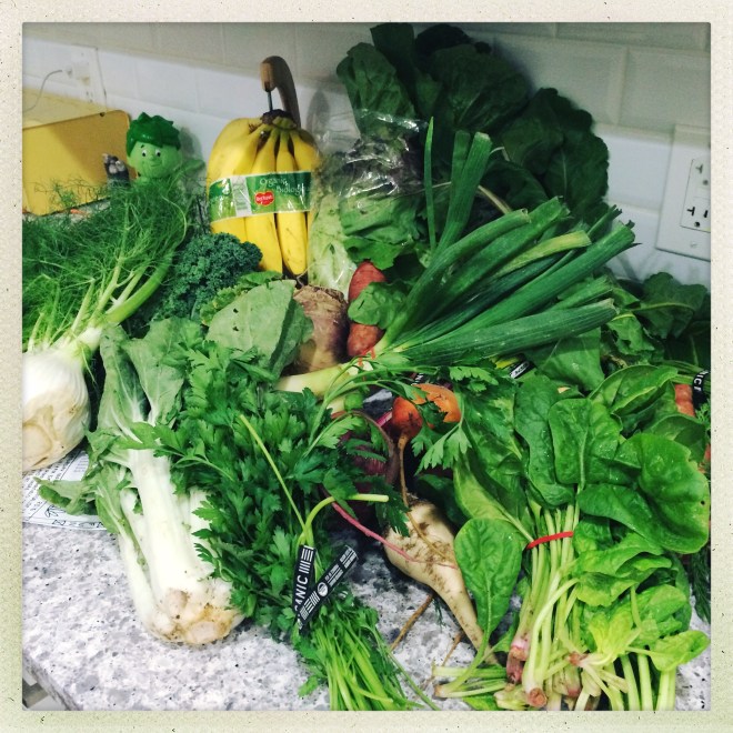 Here’s what I picked up: chiogga beets, golden beets, bok choi, carrots, chard, kale, spinach, fennel, parsley, lettuce, spring onions, sweet potatoes (ugh), red radish, and rutabaga.