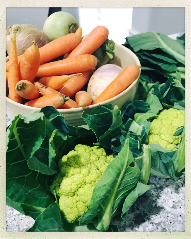 Nice wintery haul today: turnips, carrots, radishes, rutabaga, beets, cauliflower, collards, spinach, kale, and grapefruits.