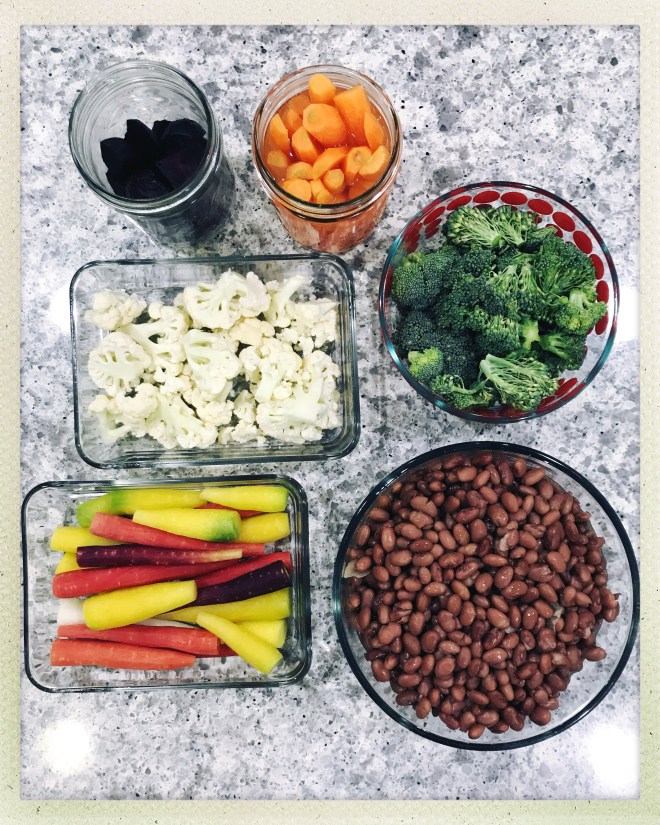 We just wrapped a near perfect birthday weekend that was filled with loads of family time and yummy eats. And now… we have a week of very normal stuff (meetings and tax prep and labs and classes and all the other stuff that fills the in betweens). Got a jump start on food by prepping a batch of pink beans, raw veggies, and roasted beets. Broad strokes for a week’s worth of meals below: