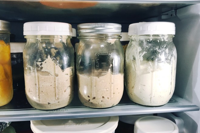 I transitioned that sourdough to all whole wheat. It is alive, but definitely nowhere near as bubbly as the AP one. I’ve started monitoring my discard in glass mason jars in the fridge so I can see the difference in activity from day to day and gave tonight’s feeding the teensiest bit of honey to see if the sugar helps it along.