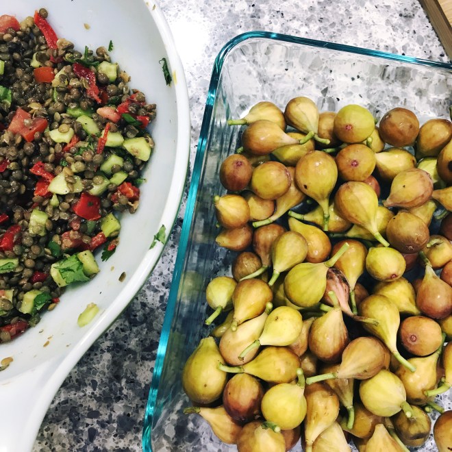 We have reached the don’t-make-the-kitchen-hot part of summer. Meals are quick, ovens are torture, the backyard figs are starting to pile up . I only have a few pounds so far but there are usually several pounds every day for a week straight. This is what my week in the kitchen looks like so far: