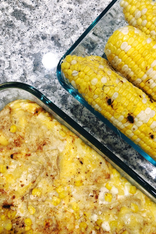 The time for eating light, but frequently has arrived. It is well over 100° out there. We’ve been sticking to light and brothy soups, salads, and sandwiches for the most part, but at least once a week we have to make something more belly-filling. This week it is this tortilla casserole which is just corn on corn with corn topped with cheese!