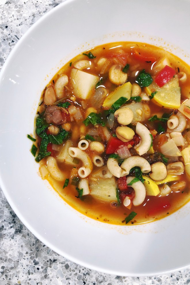 The other awesome thing about this time of year is the meeting of two growing seasons. This week’s CSA had peppers and summer squash (still), but we also had lots of greens which made for a perfect riff on a minestrone with peppers, summer squash, potatoes, some fancy Italian legume from Rancho Gordo – cicerchia.