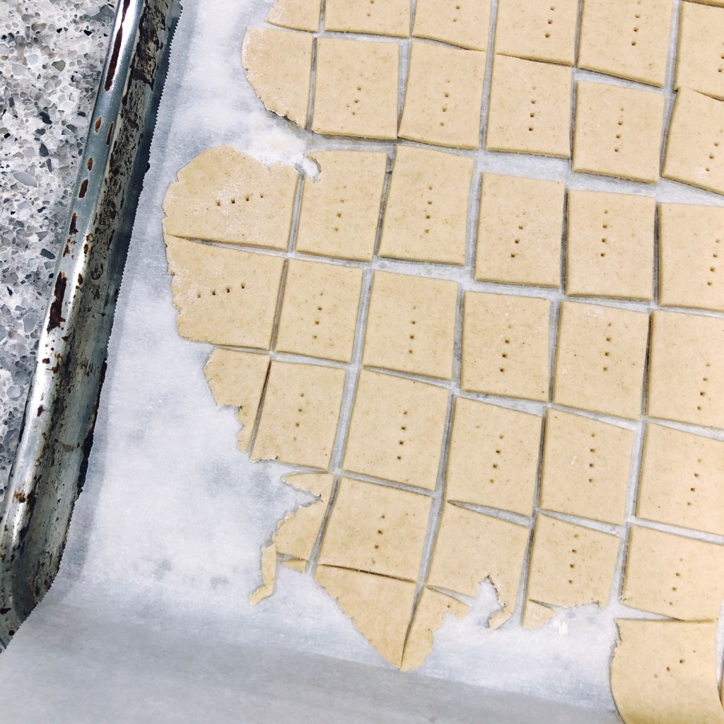 Cut into one inch squares (no need to separate them into individual pieces) and poke some holes into each with a fork. If you like a salty cracker, now is the time to sprinkle on some sea salt or kosher salt. Transfer the parchment sheet with cracker dough to your pan.