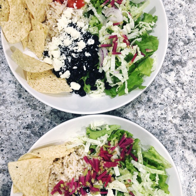 Pictured taco salad is green leaf lettuce, shredded napa cabbage, watermelon radish, tomatoes, red onions, black beans, brown rice, queso fresco, tortilla chips. Used a shelf-stable salsa from my homemade pantry as a dressing. Sour cream encouraged by my housemates. 😉
