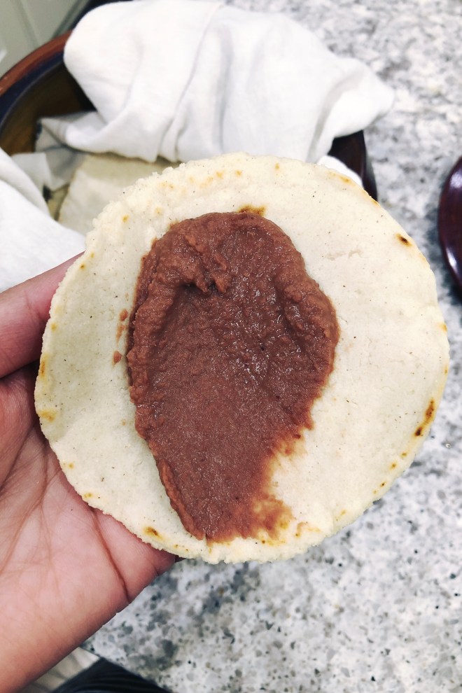 Pictured: fresh and warm corn tortilla with smear of refried beans.