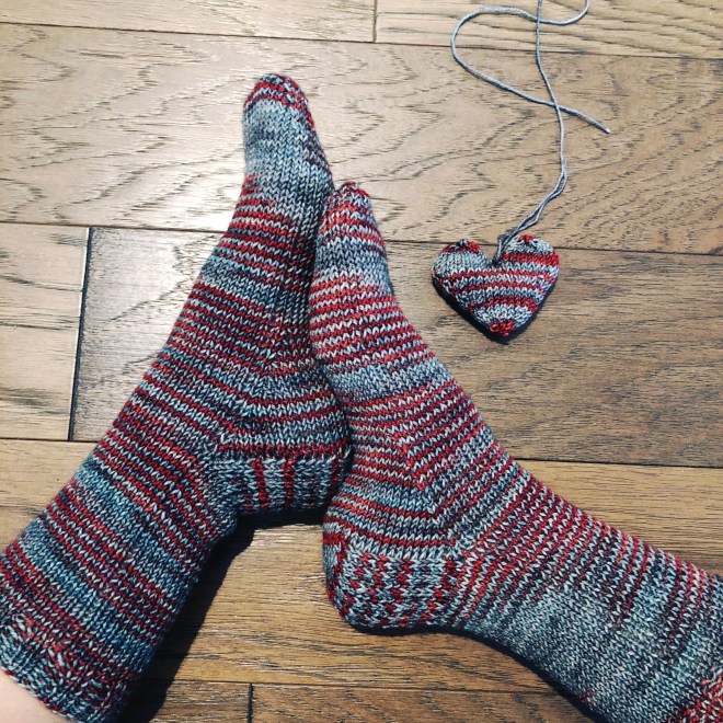 I decided a thing today! Gonna whip up these quick little hearts when I finish a pair as a way to keep track of how many I finish this year. I should have a dozen or two by year’s end and will decide at that point if I use them as tree decorations or to add to gifts. 🙂