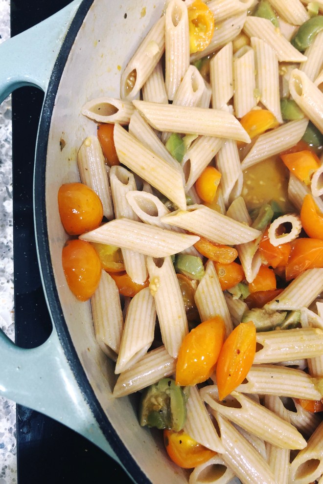 … is a quick pasta with nothing but tomatoes lightly cooked in a bit of balsamic and olive oil. Went a little extra and added some olives. Fresh parm at the table.