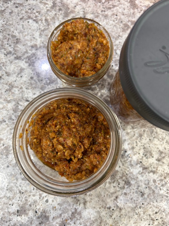 Well… I am in the middle of another surge of energy and am doing my best to at least do some solid stocking of the freezer in the process. Soup season usually means lots of broth, but my freezer can’t really spare the space sooooo I am diving into homemade bouillon which I can freeze into 1-2 oz portions. I used the recipe from The River Cottage Preserves book by Pam Corbin as a template for proportions, swapping out some veggies for things I had on hand. My mix: celery, yellow onion, scallions, turnips, parsley, cilantro, dehydrated tomato skins, garlic, carrots and a whole lot less salt.