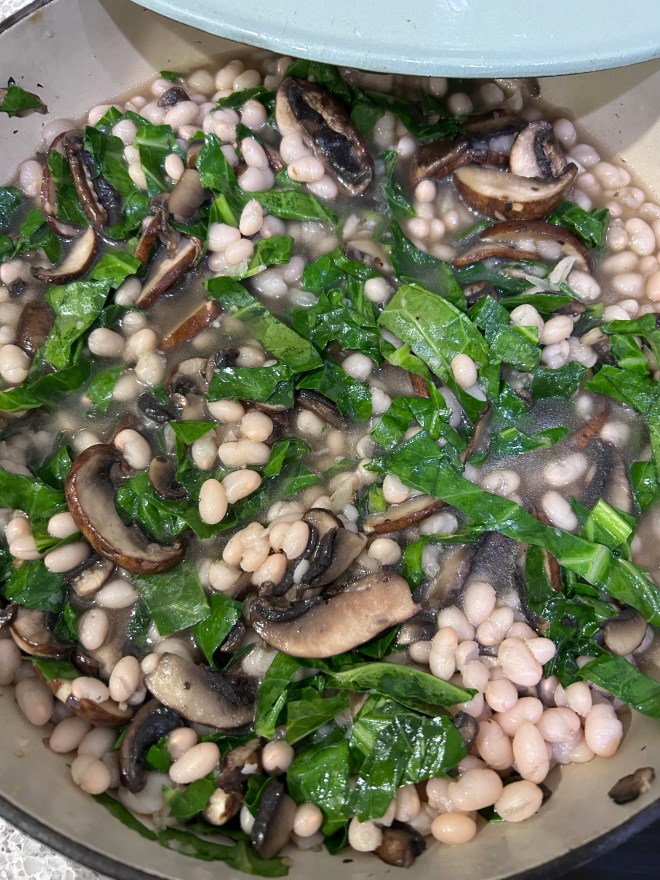Somewhere along the way, the soups in our “soup and bread” thanksgiving meals lost their broth and then someone suggested mashed potatoes as a go with… so now we are a “beans and ‘taters” house for this slow day at home. The beans come from the cupboard. The greens that go with the beans are generally kale, but this year the CSA box had collards. The mashed potatoes will get mushed shortly and they’ll get flavored with whatever the designated musher decides to add in.