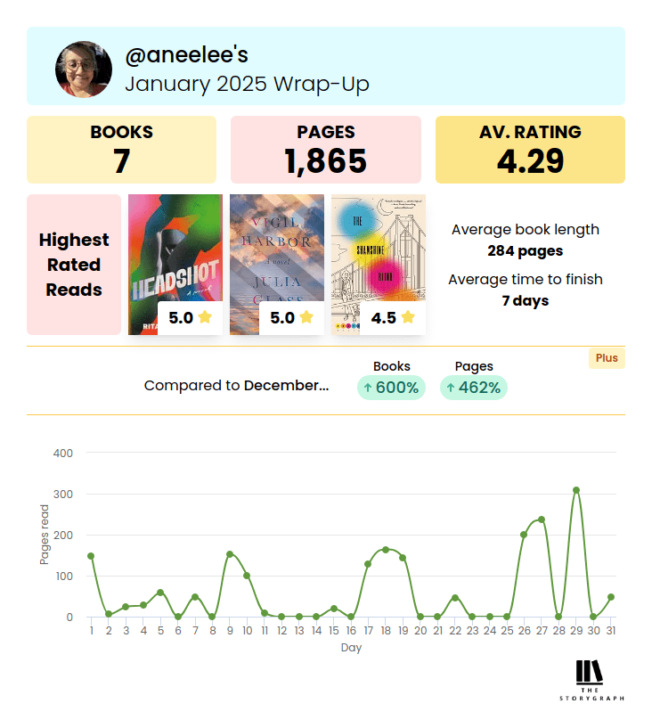 Lots of things apparently. It’s like I had years of not reading much to make up for. I abandoned Goodreads a few years ago and love Storygraph to track all things books. Started the year with one of my all-time favorite authors, Julia Glass, in a not so sleepy little town by the name of Vigil Harbor. Traversed through an alternate Bay Area where the US government has collapsed and then wrapped in the middle of a girls boxing tournament. Books are fun, yo, and I am so happy to be spending my down time this way.