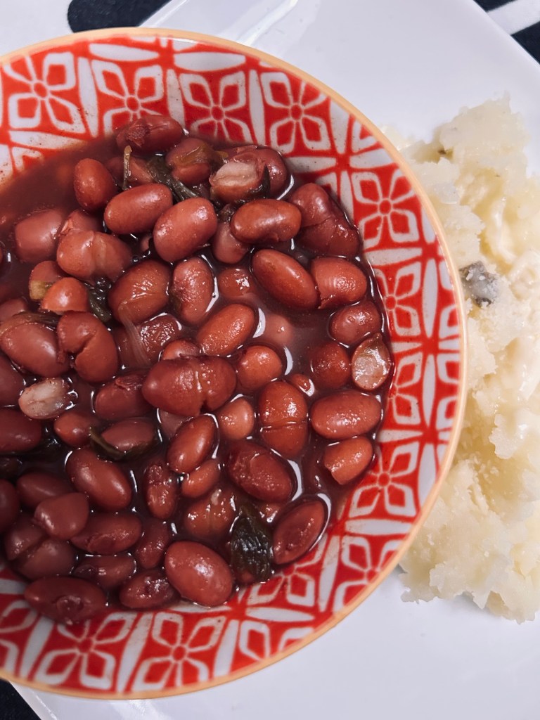Pinquitos make a great BBQ bean. Shortcutted a version that adds bottled sauce to already simmering stovetop beans and made a quick mash for this weeknight dinner.
