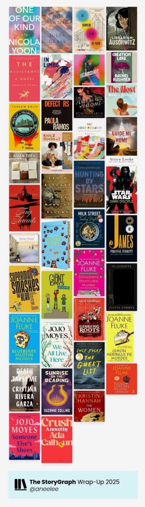 It was a really different year of reading for me. I didn’t dive into much of my usual literary fiction or dystopian bits mostly cause I needed an escape from all the dread and horror on the news. I ended up with significantly lighter faire – Joanna Fluke’s bakery murder mysteries and lots of how-to books (not all captured in Storygraph. My favorites this year though? Headshot. James. Death Takes Me. Blackouts.